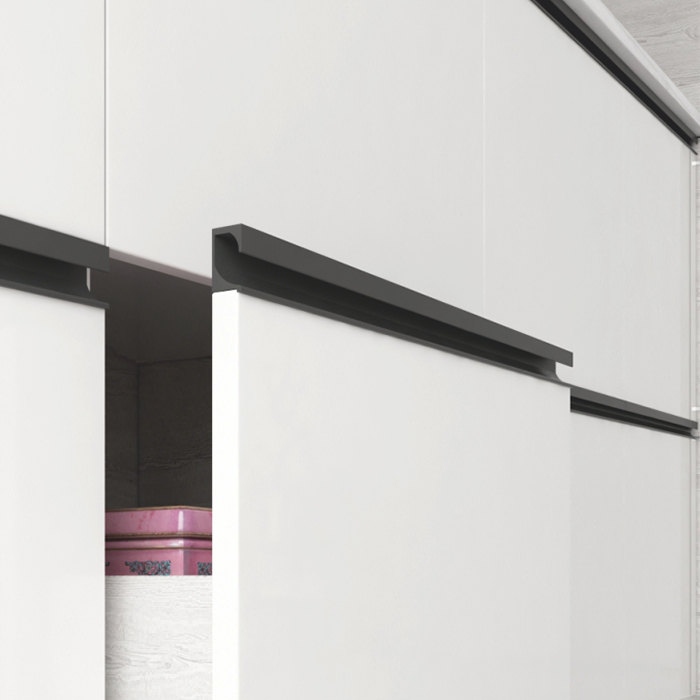 The Eslinga G Handle Profile is designed to integrate seamlessly into cabinet fronts, offering a sleek appearance. Available in 35 mm, 40 mm, and 45 mm profile heights, it caters to varied design requirements while maintaining ergonomic grip functionality. The profile is crafted from high quality aluminium and offered in both silver anodized, dark champagne, rose gold and black matt finishes for a truly refined, modern look.
